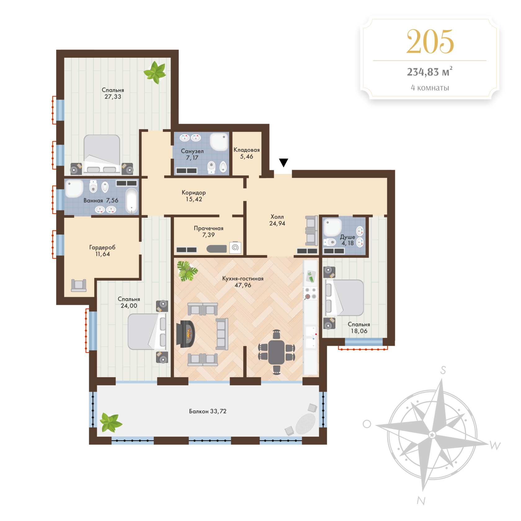 Самая лаконичная резиденция для небольшой семьи. Исключительные виды на Волгу и проплывающие круизные лайнеры. Единственное, что можно добавить – это единственная резиденция в доме такой площади. Гостиная с камином – само собой.