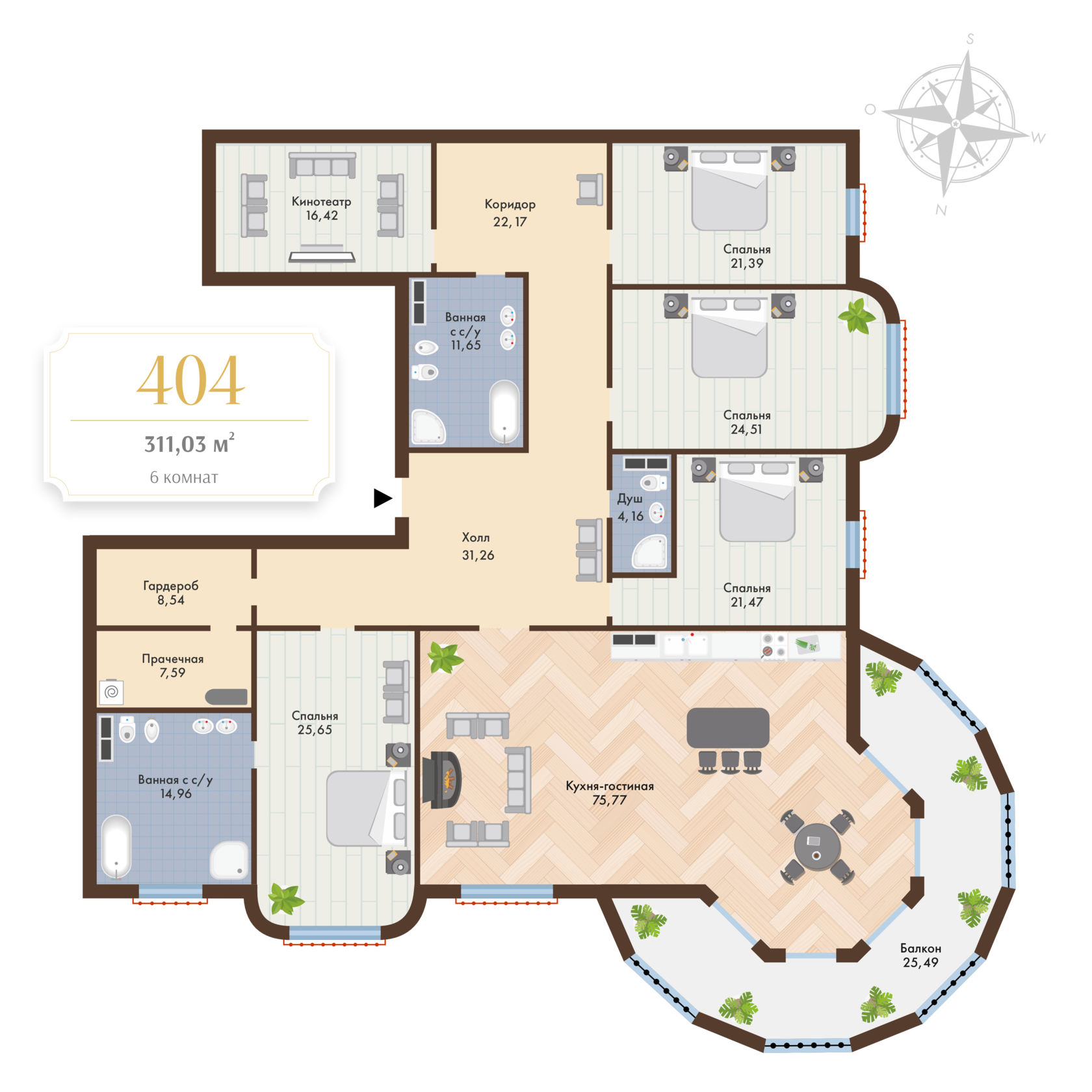 Резиденция с исключительными видами – все окна выходят на Волгу. Из окон полукруглой гостиной открывается панорамный вид на Екатериновку с высоты 12 метров. Спальня хозяев, расположена в удалении от общественных зон, что дарит владельцам особую приватность. Полукруглый балкон, собственный кинотеатр, индивидуальный доступ на этаж. Эркеры в спальнях создают неповторимый уют. В особняке всего три подобных резиденции.